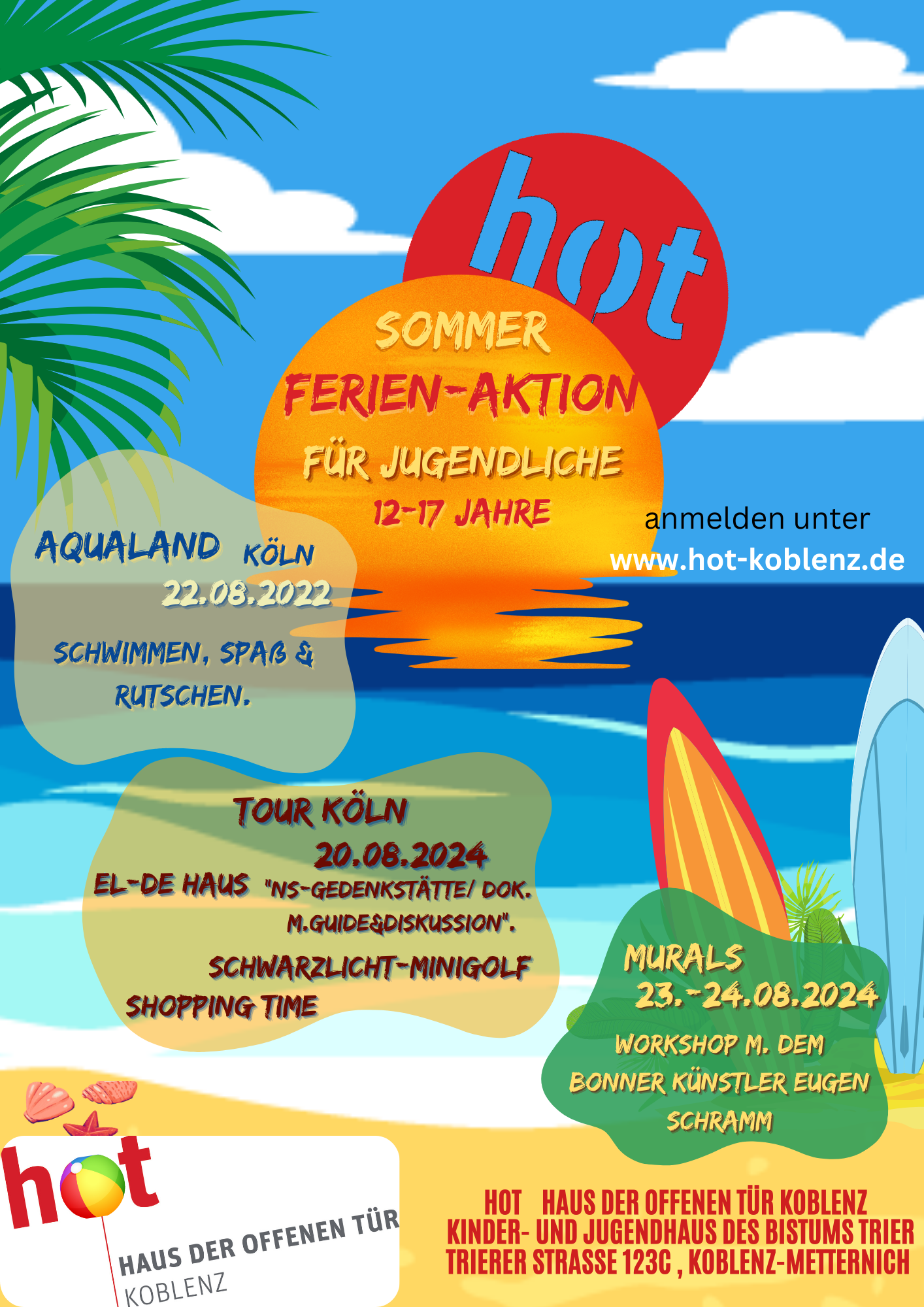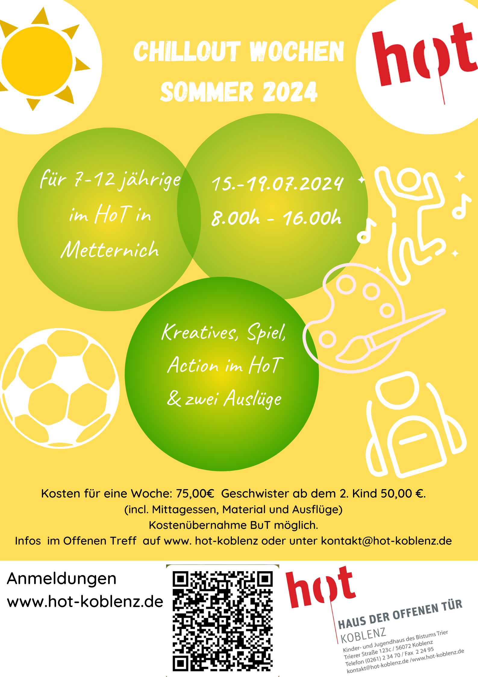 In den Sommerferien und den Herbsferien sind unsere Chillout-Wochen angesagt. Dann wird eine Woche das HoT zur Spiel-Aktion-Kreativ-Chill-Area für Kinder von 7 – 12 Jahren Eine Chilllout-Woche geht von Montag bis Freitag, täglich von 8.00h – 16.00h. Die Teilnahme ist nur für eine gesamte Woche möglich, nicht für einzelne Tage.