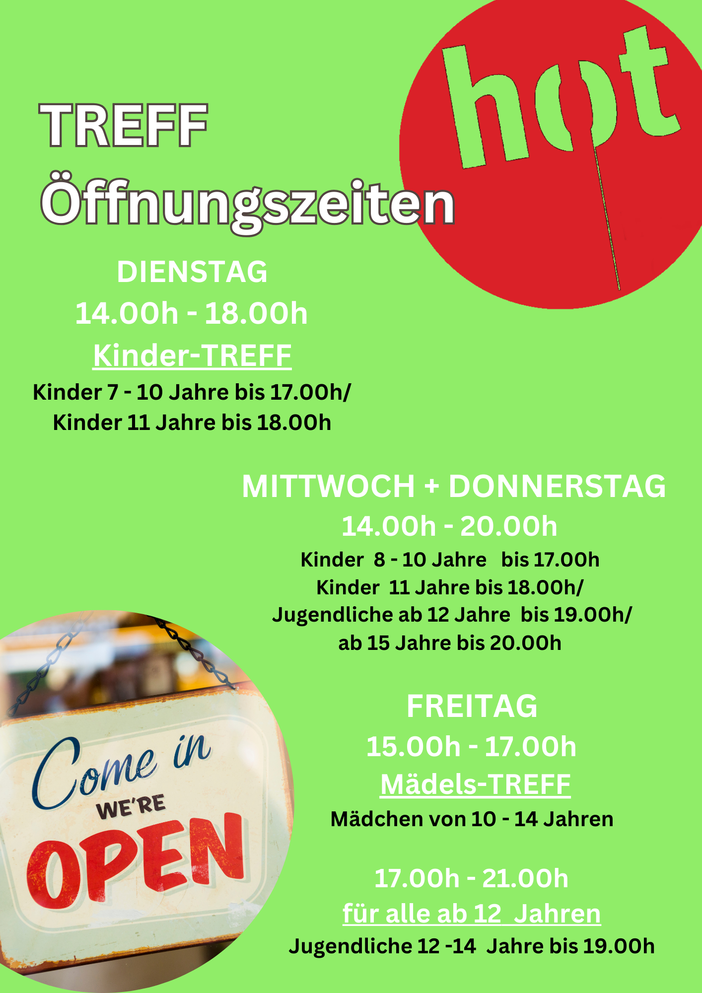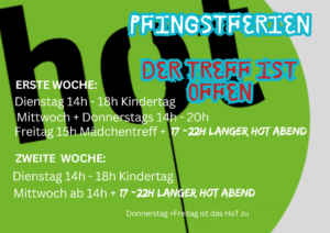 * Wichtiger Hinweis für Eltern: Das HoT ist eine Einrichtung der Offenen Kinder- und Jugendarbeit. Im Rahmen des Offenen Treffs sind alle Angebote freiwillig und offen und brauchen in der Regel keine Anmeldung. Die Kinder und Jugendlichen können ins Haus kommen und es verlassen, wie sie möchten. Daher können die Mitarbeiter*innen des HoT keine Aufsichtspflichtübernehmen.